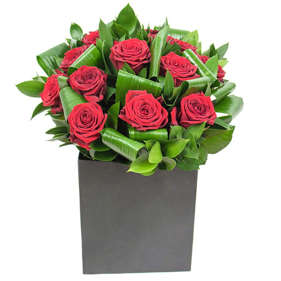 Embrace the timeless beauty of our bouquet featuring stunning red roses, vibrant aspidistra leaves, and delicate ruscus. This unique combination offers a perfectly balanced and elegant floral display.
