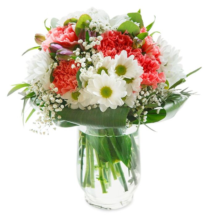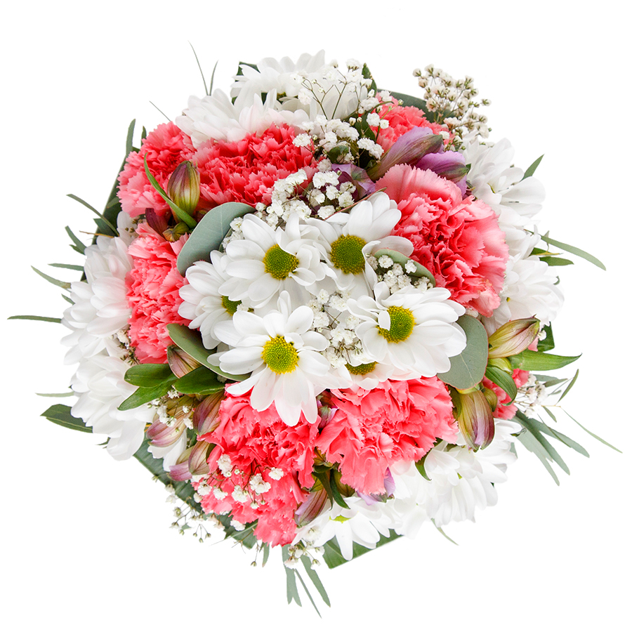 Our Classic White & Pink Flower Bouquet is a timeless choice for any occasion. This unique arrangement features snow-white chrysanthemums, delicate gypsophila, and soft light pink carnations, all elegantly arranged with lush aspidistra leaves to create a stunning display.